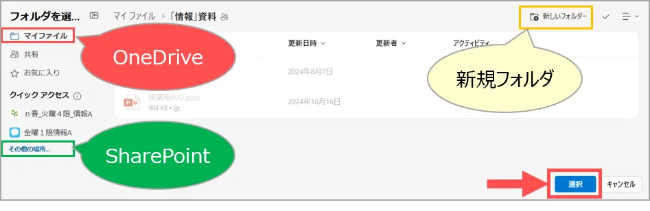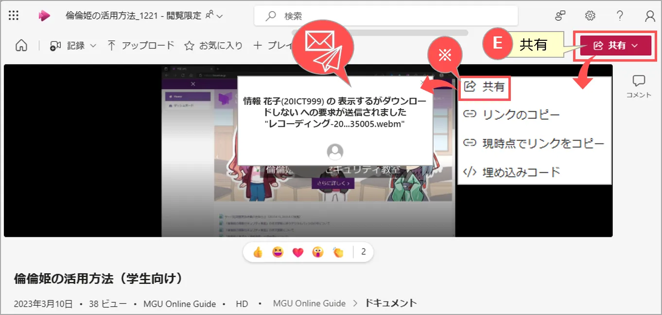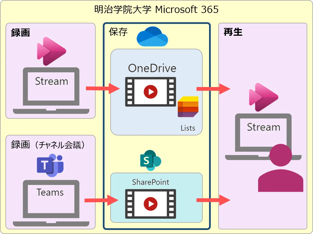 動画ファイルは、個人の OneDrive(または学内共用の SharePoint)に保存され、安全な共有設定や管理を行うことができます。