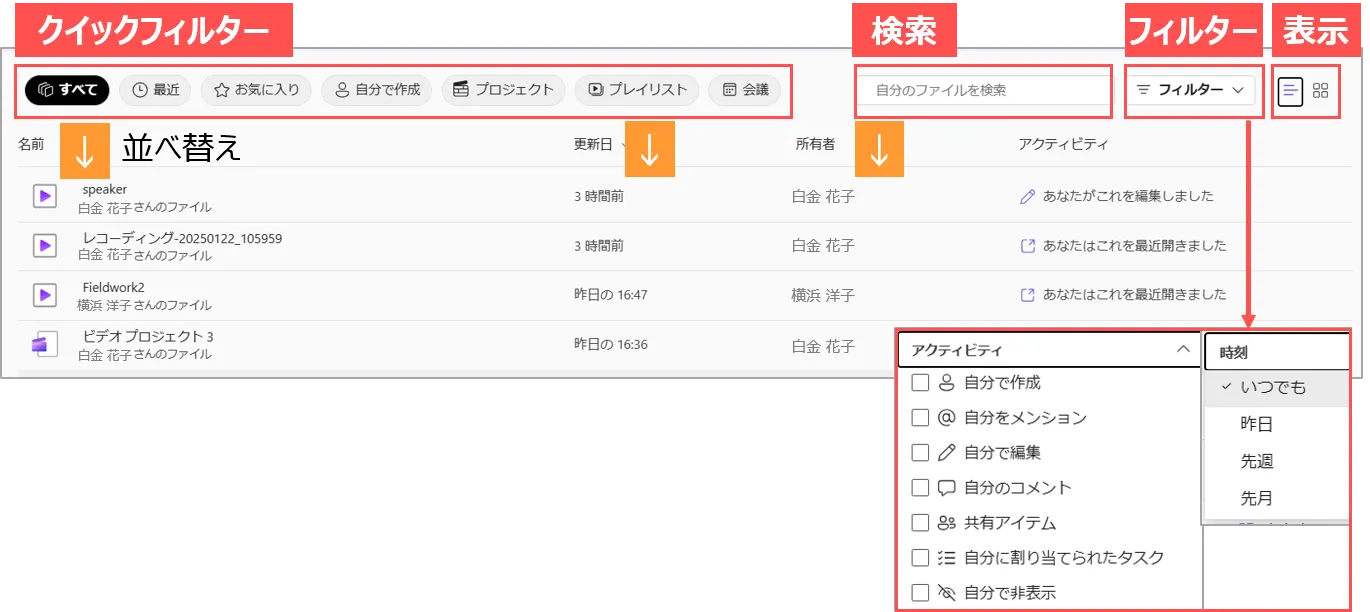 • 本学の Microsoft 365 上の動画のうち、自分にアクセス権のある動画が表示されるエリアです。