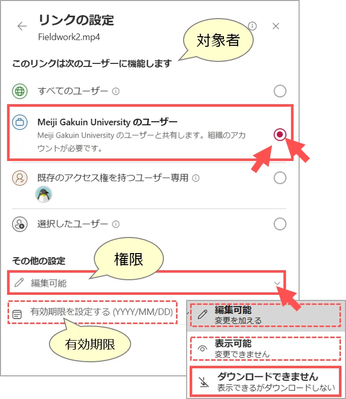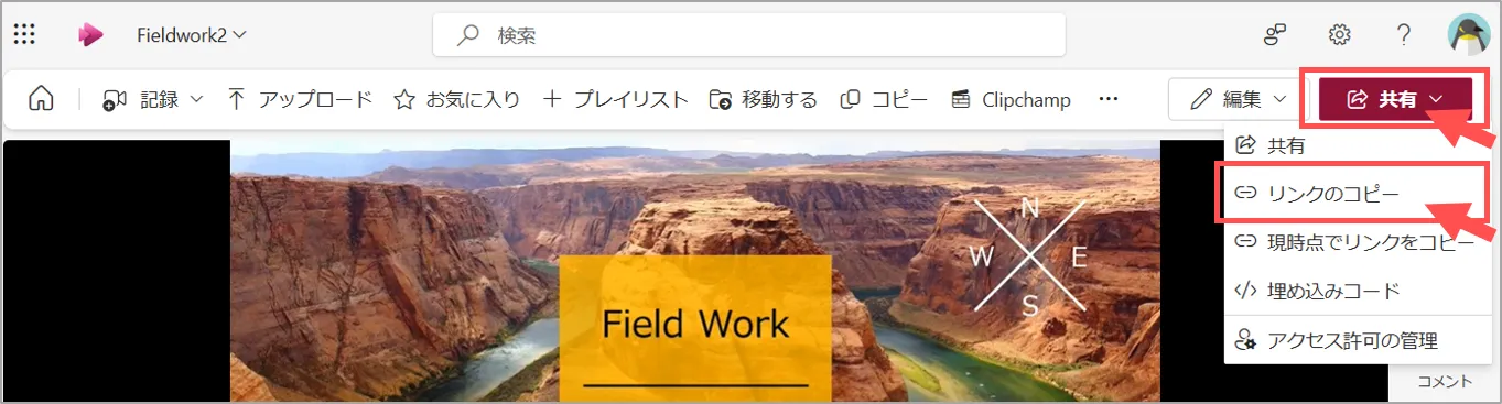 ※動画ファイルの保存先(OneDrive等)のフォルダに共有設定をする場合は、対象のマニュアルを参照。▶「OneDrive:共有する