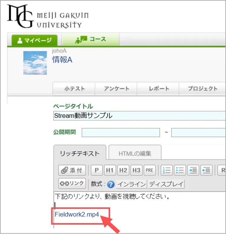 • ここでは、一つの動画ファイルを manaba に掲載して履修生に共有する方法を説明します。