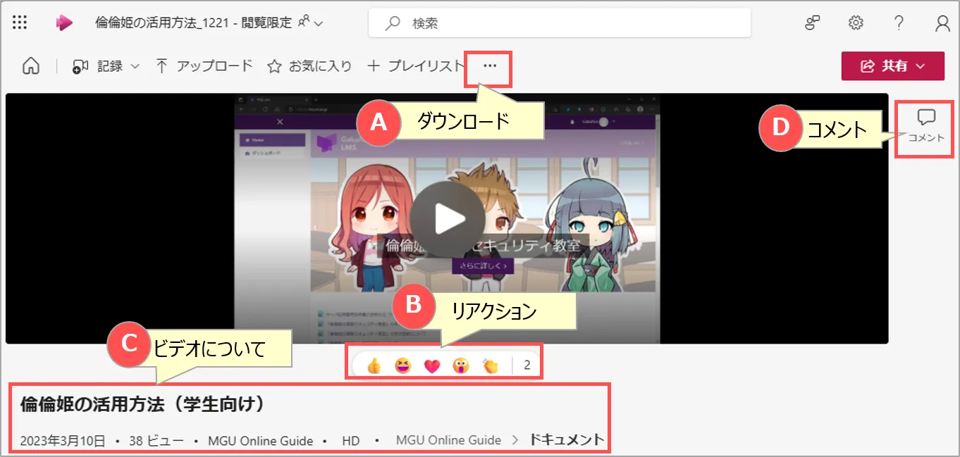 • A~Dの項目は、動画の所有者の設定により「許可」された動画にのみ表示されます。